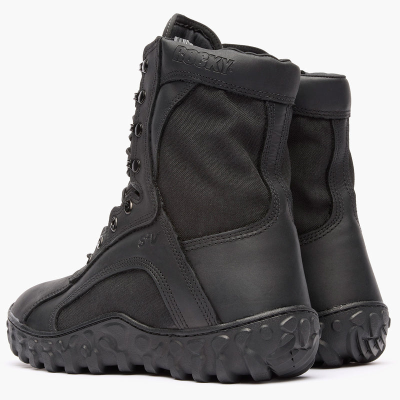 The Rocky® S2V Tactical Military Boots are the ultimate combat boots. This footwear is the top choice for all military personal because they are built for quick maneuvers and fast-paced action. The flash- and water-resistant leather is geared to protect your feet from quick flashes and rope burn. The boots also boast 1,000-Denier nylon technology in the sides and panels with a coating that serves as a flame retardant. These black boots can easily handle wet and cold conditions thanks to the addition of a Berry compliant components waterproof membrane, and 600 grams of thermal Insulation. To maximize comfort, the military boots also have triple-stitched uppers and proprietary high-walled Vibram® soles, along with a perforated Air-Port cushion footbed and PU midsoles. They are outfitted with an Aegis® Microbe Shield to prevent bacteria and fungus growth. Made in the USA, the Rocky S2V Tactical Military Boots are Berry Compliant. Eight inches in height.