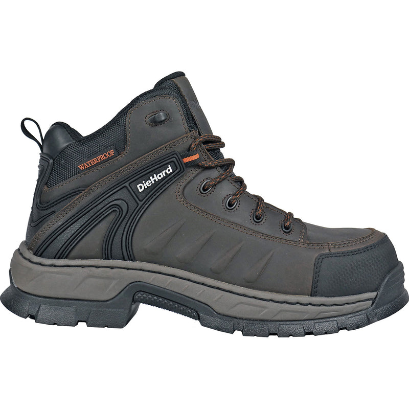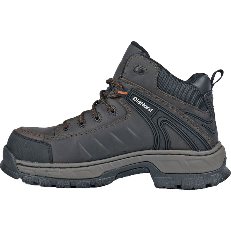 You can count on the DieHard brand for reliable performance. The Squire by DieHard is a 5-inch lace-up safety toe work boot with a brown crazy horse leather upper has a reinforced heel and toe to mitigate abrasion. A little extra height and sloped top line with padded collar allows for transitions in movement, while keeping ankles comfortable. A TPU support system gives you stability, while the rebound EVA midsole supplies spring. Attached to the midsole with cement construction is a durable, slip-resisting rubber outsole.