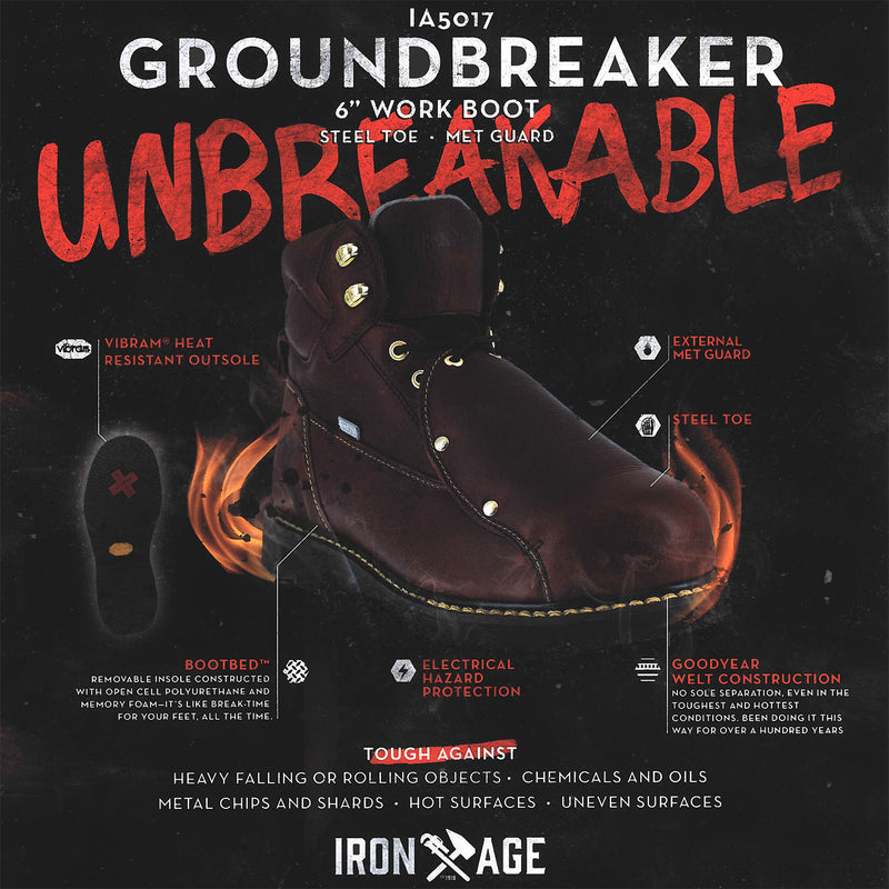 The Iron Age Groundbreaker is a workhorse of a boot. Built to withstand natural elements and man-made challenges, this 6 inch lace-up boot with external metatarsal guard has the quality materials and construction you need to handle the job.