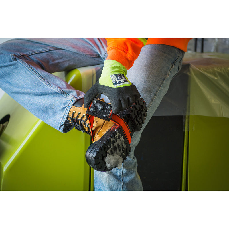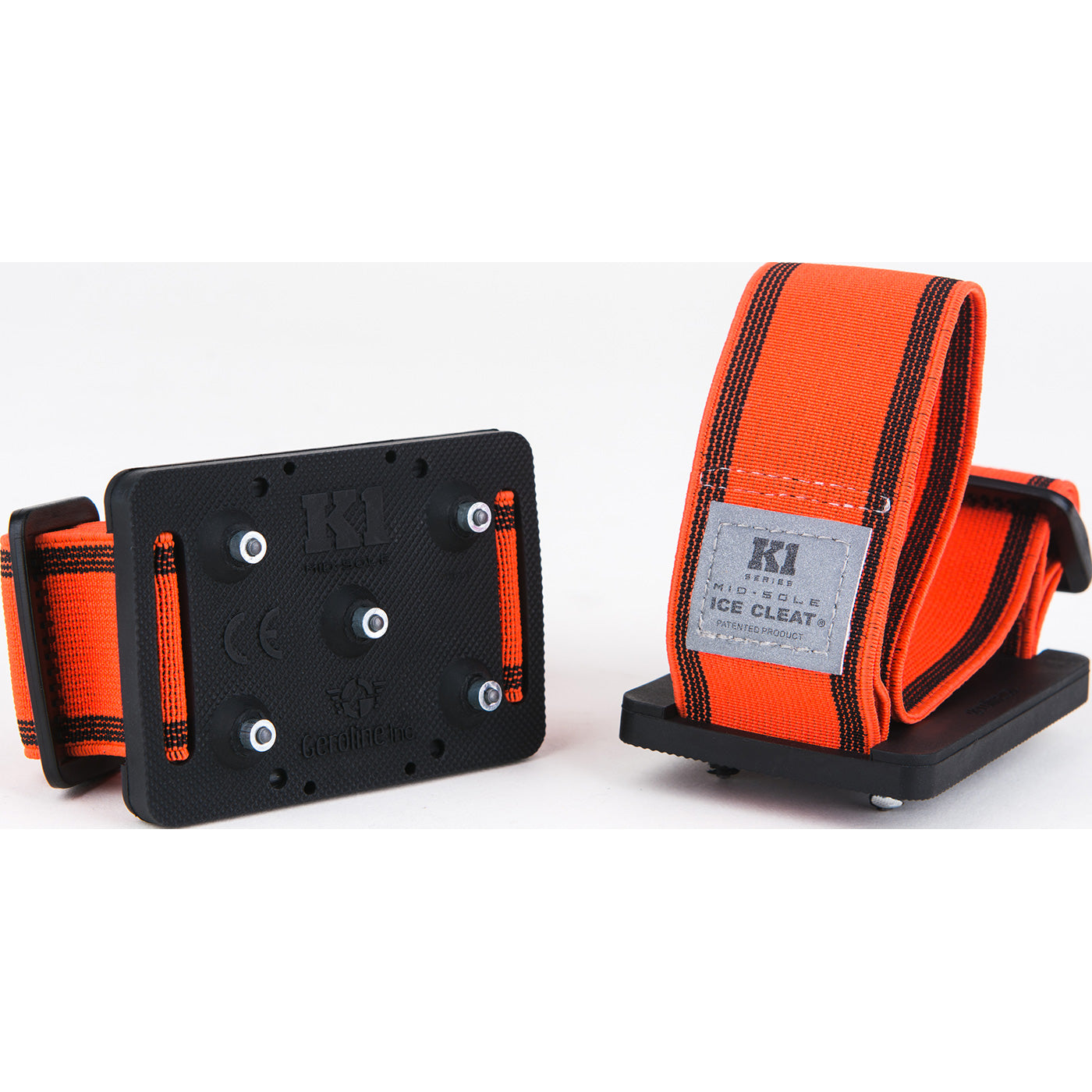 The K1 Series Mid-Sole Ice Cleat Original is designed for work boots with a defined heel. A 15mm pad containing five 7.2mm tungsten carbide studs is easily positioned underfoot, in the mid-sole area, when traction is needed. This pad can then be slid along an adjustable, high visibility orange strap with reflective patch to the top of the boot and out of the way, allowing you to easily perform other tasks.