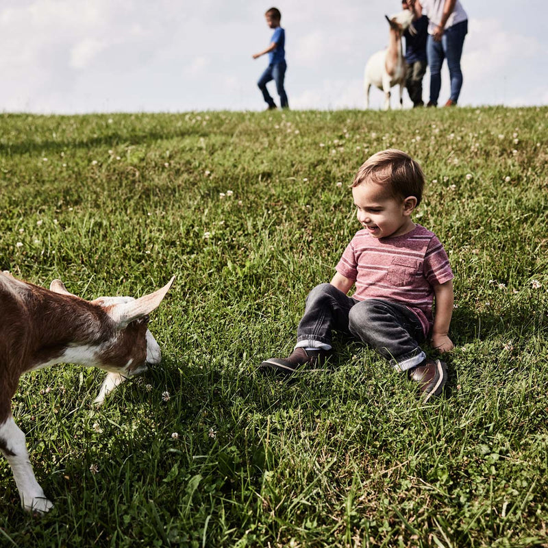 Child sitting on grass with a goat in a field
