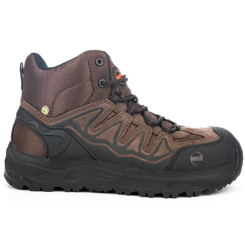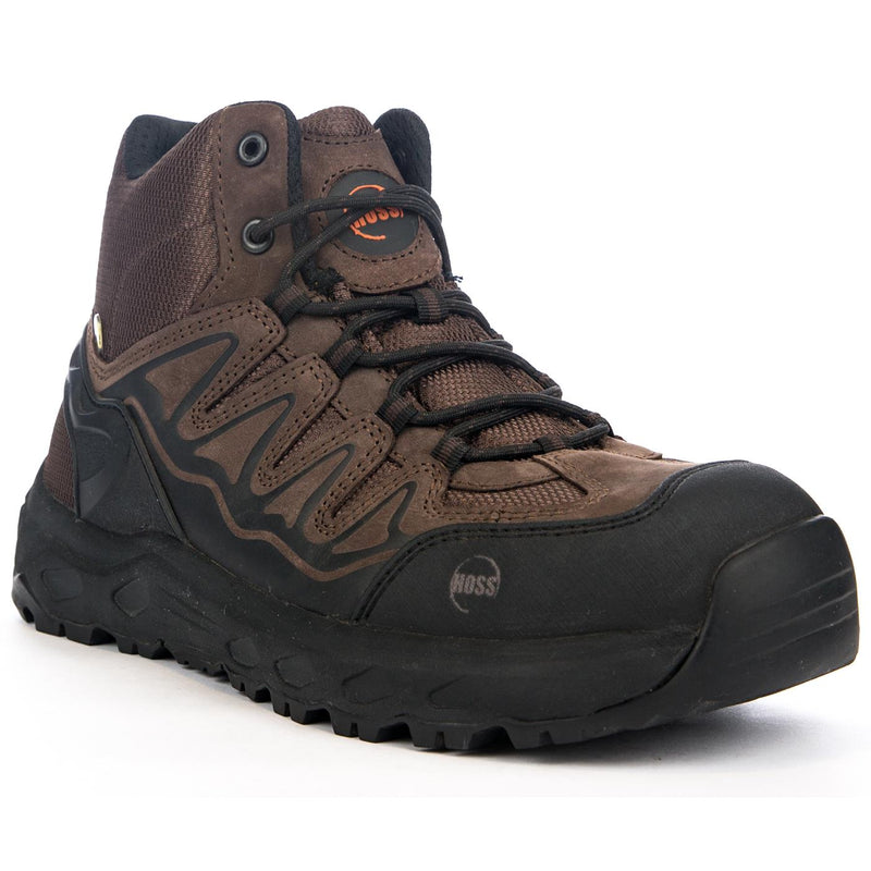 The HOSS boot with its stable wedge platform and roomy oblique safety toe will keep you comfortable and protected all day. Pick up a pair of the HOSS Eric HI brown safety boots today.