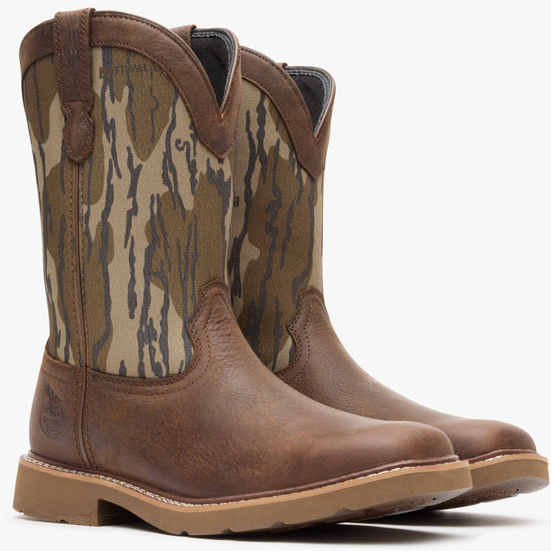 This brown boot features full-grain leather and a Mossy Oak Bottomlands print upper. The interior features our ultra-comfortable AMP (Advanced Memory Polyurethane) insole for maximum cushioning and shock absorption.