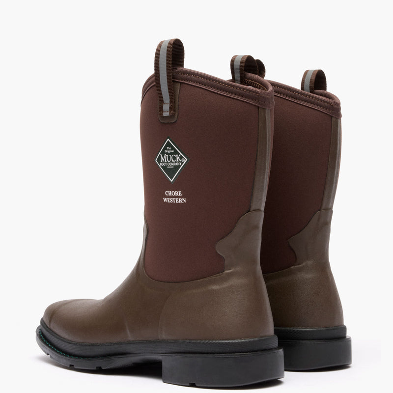 We’ve redesigned our iconic Chore with a Western boot flair. The classic Muck Boot neoprene adjusts to the unique contours of your foot, making these reliable boots flexible and 100% waterproof. The rubber overlay is easy to clean while the XPRESSCOOL™ lining keeps feet cool and dry. The molded heel kick off and lower outsole lug protect your foot from getting caught in stirrups. These tough boots feature a new square toe and pull-on side straps reminiscent of Western boots, as well as our quick cleaning rubber sole, offering more security and durability for every job.