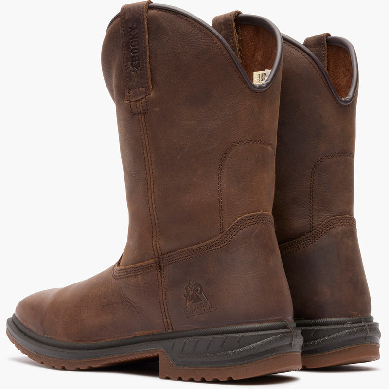 Ready to take on the day, these men's Rocky Worksmart western work boots tackle any job with full grain SPR leather. The tough direct attached rubber and polyurethane outsole that is oil-, slip-, and abrasion-resisting keeps you safe while the unlined shaft keeps you cool. Getting into these boots is easier than ever with Rocky's Expansion Fit Seam that stretches when putting the boot on and then returns to its original shape. Take on the day with comfort and protection with the Rocky WorkSmart Collection. Buy your pair of these western-styled Rocky wellingtons today.