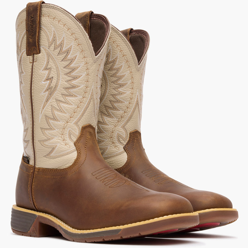 The Rocky Rugged Trail Waterproof western boot is built to tackle any true western terrain. Crafted with a neutral bone upper and rich waterproof full-grain leather, this boot is not only durable but equipped to get the job done. Light and flexible cement construction makes this boot practical and comfortable.