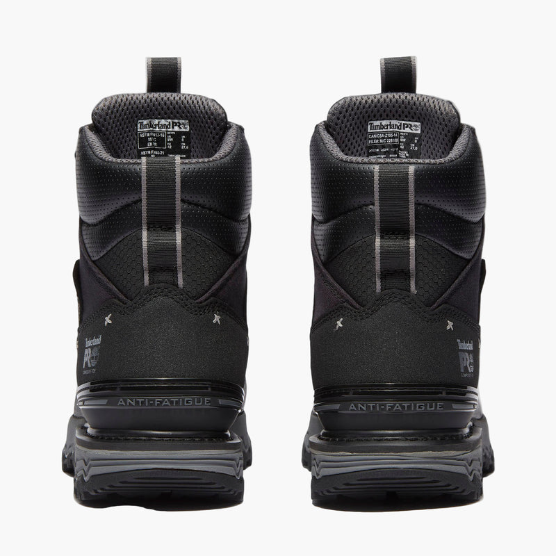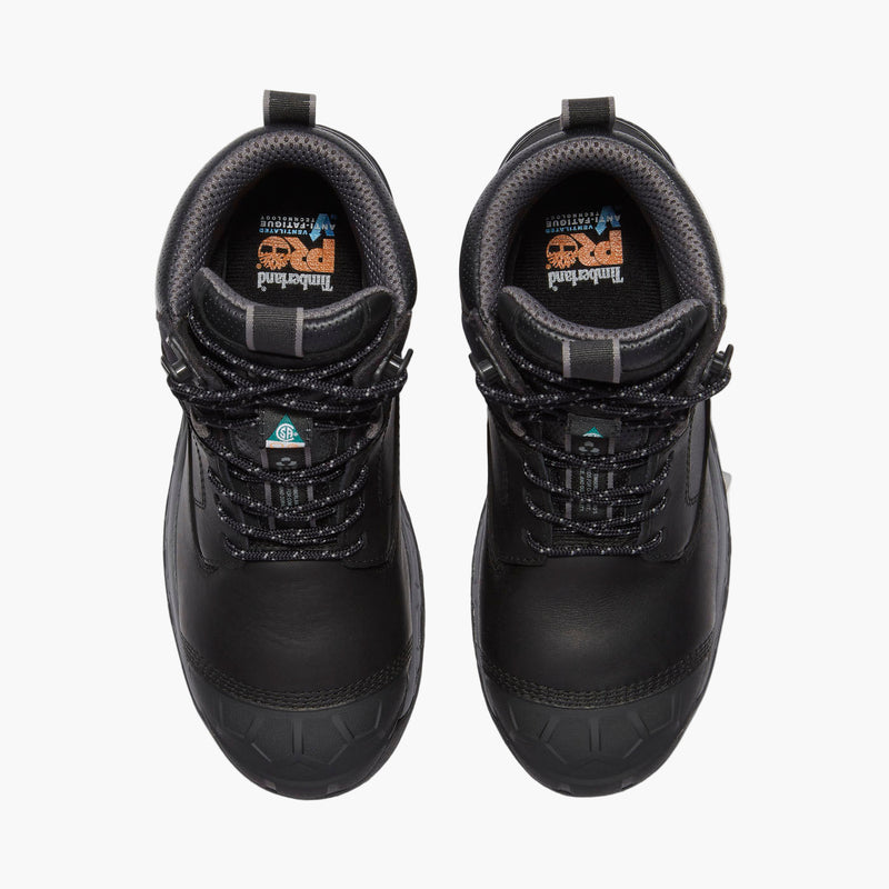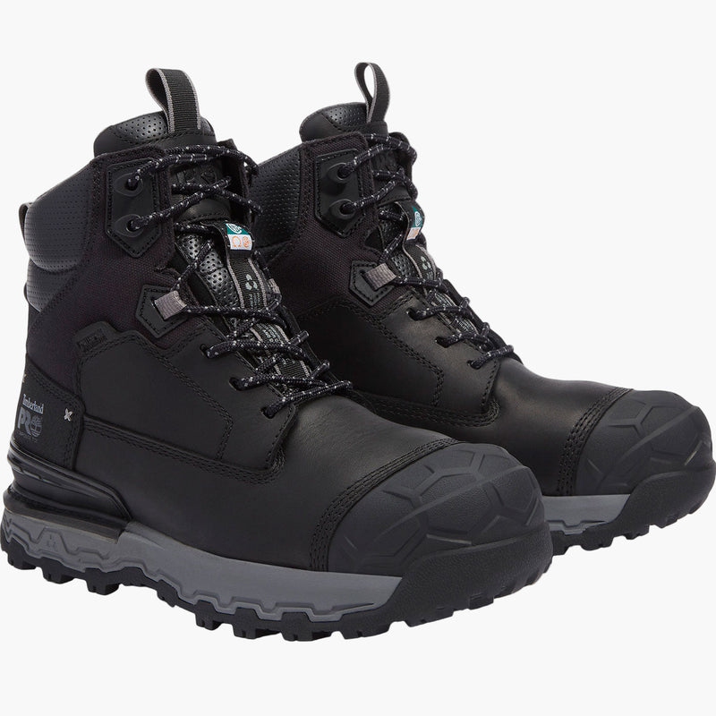 Introducing the Timberland PRO Boondock Ultralight CSA boot. This 6-inch black waterproof leather boot, with waterproof membrane, features weight-reducing materials that come together for a lightweight, high-performing boot. Meeting Canadian CSA and US ASTM safety toe work footwear standards, these boots have a composite safety toe, and supply underfoot electrical hazard and puncture-resisting protection. Cemented to the upper is a TPU outsole that is slip-resisting to ASTM F3445 standards and has a defined heel. Anti-fatigue technology supplies all-day comfort whether you spend the day walking or standing. Heel cupping provides extra cushioning and stability for the heel, and a fiberglass shank gives you arch support. Buy your pair today.