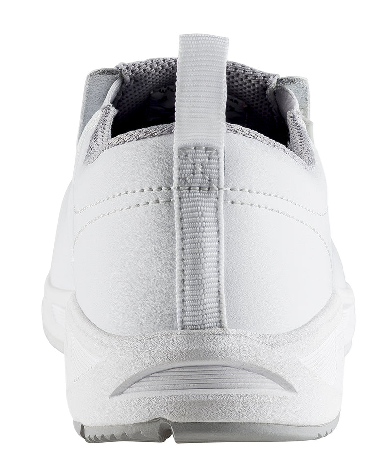 A durable full grain white leather forms the upper. A pull tab affixed to a padded collar and narrow side panels stretch, helping with foot placement. Feet will set upon a comfortable double-cushion insole that is also removable.